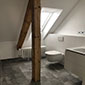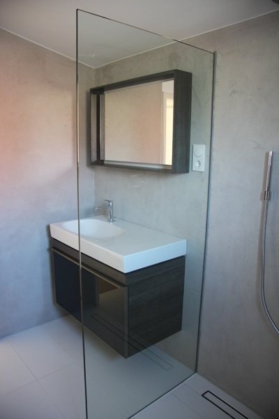 Modernes Architektenhaus. Bad und Gäste-WC-Sanierung. Zusammenspiel verschiedener Materialien. Beton Ciré im Duschbereich.