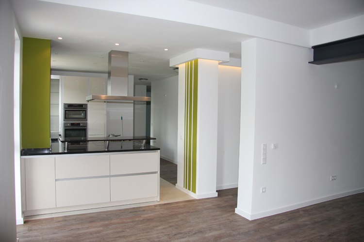 In Rahmen der Sanierungsarbeiten ist auf ca. 140,00qm eine schoene, grosszuegige und elegante Wohnung entstanden. Dabei wurde die Raumaufteilung den neuen Wohnanforderungen angepasst und erhielt ein klares und offenes Raumlayout. Die bodentiefen Fenster verleihen der Wohnung zusaetzlich mehr Komfort und Helligkeit. Das Zusammenspiel verschiedener Techniken, hochwertiger Materialien und Ausstattung sorgen fuer einzigartige Raumerlebnisse. Kernsanierung inkl. Fussbodenheizung